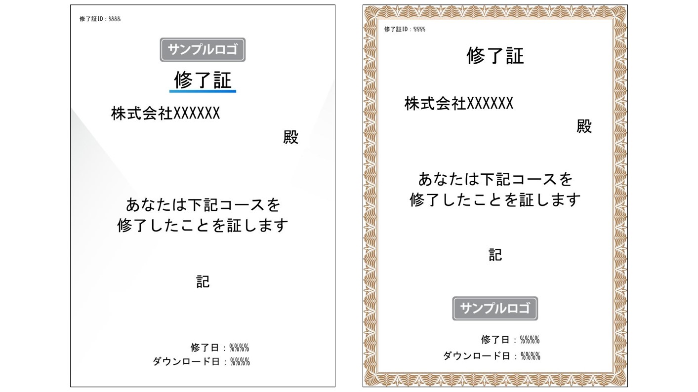 管理者は、受講者がコースを受講完了するとダウンロード可能な修了証を設定できます。修了証はユーザ名、コース名、修了日などのパラメータを自動挿入したり、テンプレートのデザインを編集することも可能です。